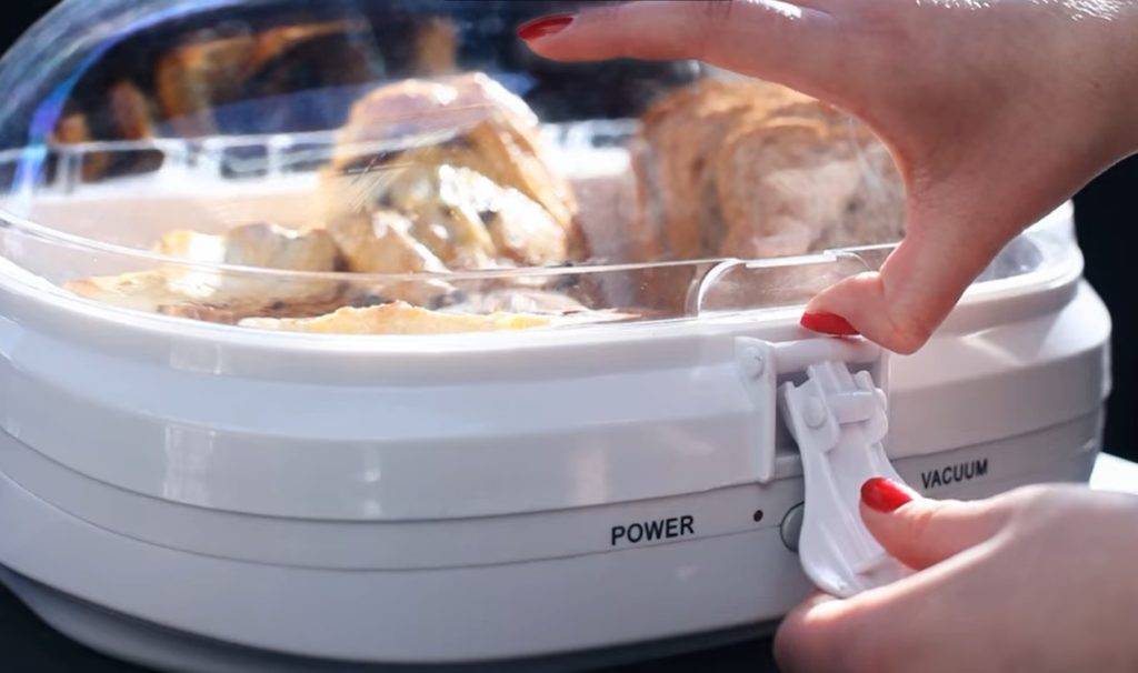 - Инновацией среди хлебниц принято считать вакуумную модель. Это стопроцентный чемпион, для которого срок хранения продукта считается просто рекордным. Это возможно за счёт откачивания воздуха из устройства. Подходит данный вариант тем, кто может в любой день уехать на несколько дней в командировку или еще по каким-то делам, не говоря уже про приключения и авантюры. Вернувшись из поездки домой, путешественник не столкнется с неприятным запахом испорченного продукта. Модель премиум-класса, поэтому стоит недешево. Незаменима, если поездки случаются часто. Помимо хлеба, может сохранить свежесть и других продуктов.