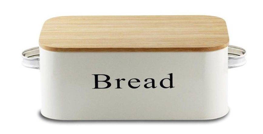 Металлическое изделие с бамбуковой крышкой – разделочной доской. Оригинальный дизайн, наличие ручек и функциональность делают модель популярной. Хлебницу можно не только использовать, как ящик для хранения булок, но и как корзину для подачи хлеба к столу, не говоря уже, что можно сразу, не отходя, нарезать хлеб. Средняя стоимость – 2270 рублей.