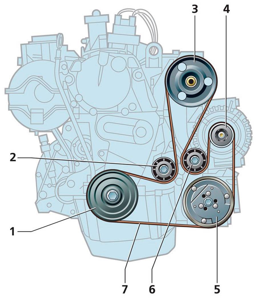 Обозначения: 1 — шкив привода навесного оборудования; 2 — натяжной ролик; 3 — шкив привода рулевого гидроусилителя; 4 — шкив собственно генератора; 5 — шкив привода системы кондиционирования; 6 — опорный ролик.