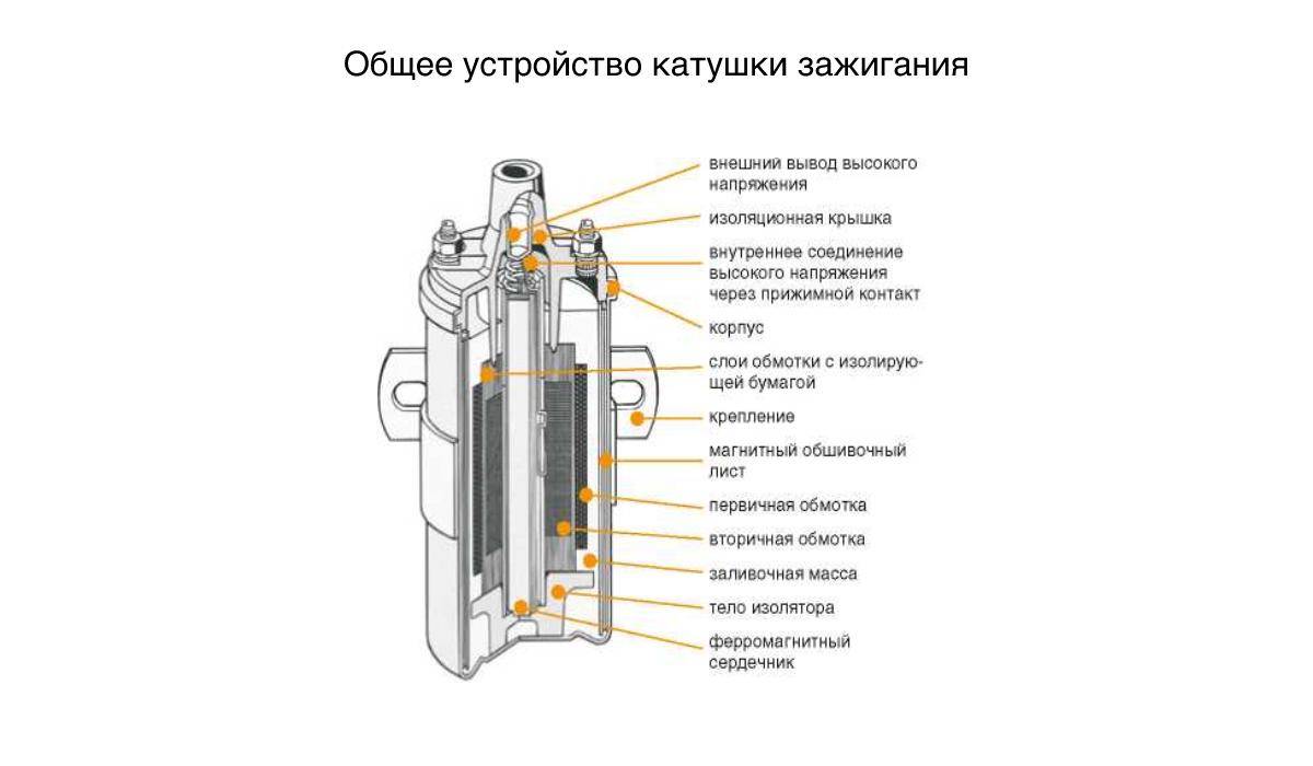 Представляет собой соединение двух обмоток. Одна состоит из малого числа витков утолщенной проволоки, первичная обмотка, принимающая низковольтные электрические импульсы (12В). Вторичная густо обвита проволокой малого сечения, образующей высоковольтный ток ( до 35000В). Посредством высоковольтной проводки, этот ток подается на трамблер, затем на свечные электроды. Там образуется дугообразный разряд и появление искры. В первой обмотке электрический ток носит постоянный характер. В мертвой позиции поршня, прерыватель размыкает цепь в обмотке №1. В соседних (вторичных) витках индуцируется ток (повышенной вольтности), и передается на свечные электроды.