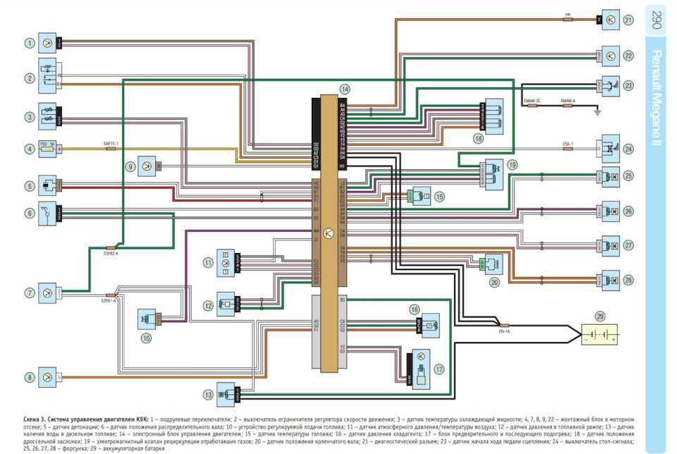 Схема соединений коммутационного блока: 1 — правый подрулевой переключатель очистителя и омывателя ветрового стекла; 2 — электродвигатель очистителя ветрового стекла; 3 — монтажный блок предохранителей в салоне; 4 — лампа левого бокового указателя поворота; 5 — лампа указателя поворота левого заднего фонаря; 6 — выключатель аварийной сигнализации; 7 — лампа правого бокового указателя поворота; 8 — лампа плафона освещения салона; 9 -лампа плафона освещения багажника; 10 — электропривод замка левой передней двери; 11 — электропривод замка левой задней двери; 12 — лампа указателя поворота левой блок-фары; 13 — лампа указателя поворота правой блок-фары; 14 — лампа указателя поворота правого заднего фонаря; 15 — электропривод замка правой передней двери; 16 — электропривод замка правой задней двери; 17 — коммутационный блок: 18 — левый подрулевой переключатель; 19 — комбинация приборов; 20 — выключатель центрального замка; 21 — катушка иммобилайзера; 22 — диагностический разъем; 23 — реле обогрева заднего стекла; 24 — ЭБУ; 25 — концевой выключатель плафона освещения салона у левой передней двери; 26 — концевой выключатель плафона освещения салона у левой задней двери; 27 — концевой выключатель плафона освещения салона у правой задней двери; 28 — выключатель плафона освещения багажника