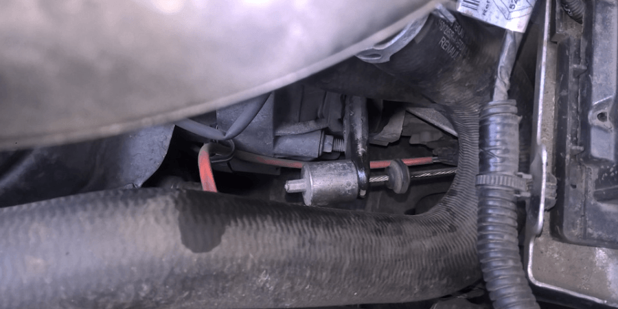 Еще трос крепится хомутом-защелкой под левой опорой двигателя(если стоять лицом к машине, то она соответственно справа), тут только на ощупь, его надо открыть как крышечку. Трос Sachs кстати имеет одетый кусок шланга-подкладку, как я понял для этой защелки, чтобы она не намертво зажимала оболочку троса.Всё, старый трос вытаскиваем через моторный отсек, перед этим нужно понять где отверстие в щитке моторного отсека — нам совать туда новый, а визуально его не видно.Трос Sachs немного отличается от того, что стоял. На оригинальном есть лишняя кубышка, которая ни за что не крепится, я не понял зачем она.На оригинальном есть какая-то дополнительная белая оболочка, которая похоже крошится, из под нее сыпется белая пластиковая крошка, на фото видно: