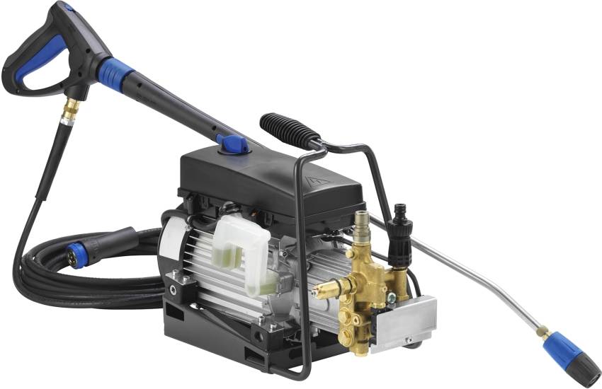 Этот более серьёзный аппарат весит 15,5 кг, имеет довольно длинный шланг – 8 метров. Максимальное давление воды составляет 140 бар, а расход — 420 л/ч. Также мойка имеет ряд насадок и встроенный фильтр.