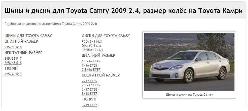 Давайте предположим, что я ищу резину на тойоту камри. Размеры резины вот такие: