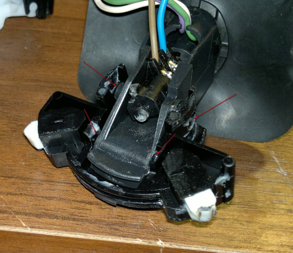 1. Сбрасываем минусовую клемму с аккумулятора.2. Снимаем кожух рулевой колонки.3. Откручиваем подрулевой переключатель от базы и отсоединяем клемму, нажав с боков на лепестки.4. Осматриваем переключатель, определяя фронт работ.С переключателя выходят несколько проводов. Нам нужны черный и красный. Ибо они чаще всего выходят из строя. У меня например черный провод обломился у самого штыря переключателя. И припаять с ходу не получалось. Поэтому пришлось разбирать полностью все. На фото уже перепаянные провода вместо заводских — стрелкой указано место облома.
