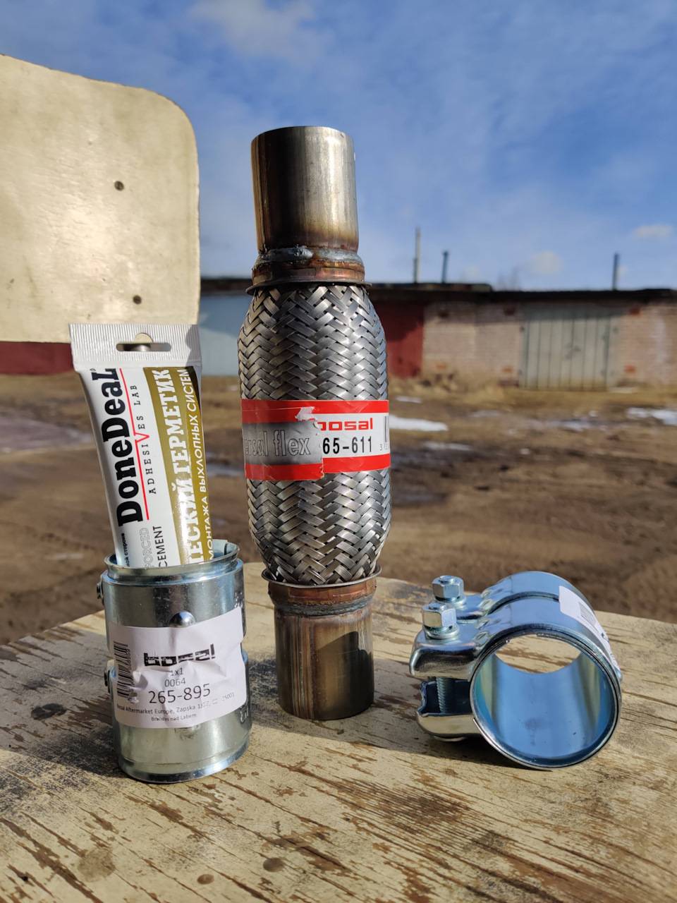 Вот правильные запчасти:1) Гофра глушителя D42mm, L272mm Bosal 265611 (1756 руб.)2) Соединительный хомут выхлопной системы Renault Clio/Kangoo/Laguna/Megane 1.2-1.6/1.9D Bosal 265895 — 2 шт. (1404 руб.)
