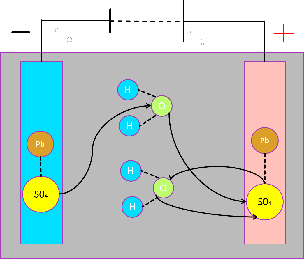 В процессе химической реакции активная масса катодов и анодов вступает в хим. Реакцию с электролитом. В результате отдачи энергии изменяется соотношение дистиллированной воды и сульфата свинца, снижается плотность электролита.
