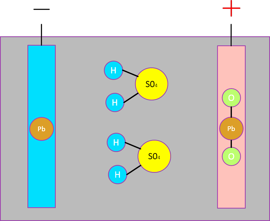 При подключении источника происходит восстановление губчатого свинца на отрицательном электроде, диоксида свинца – на положительном электроде и серной кислоты в электролите.