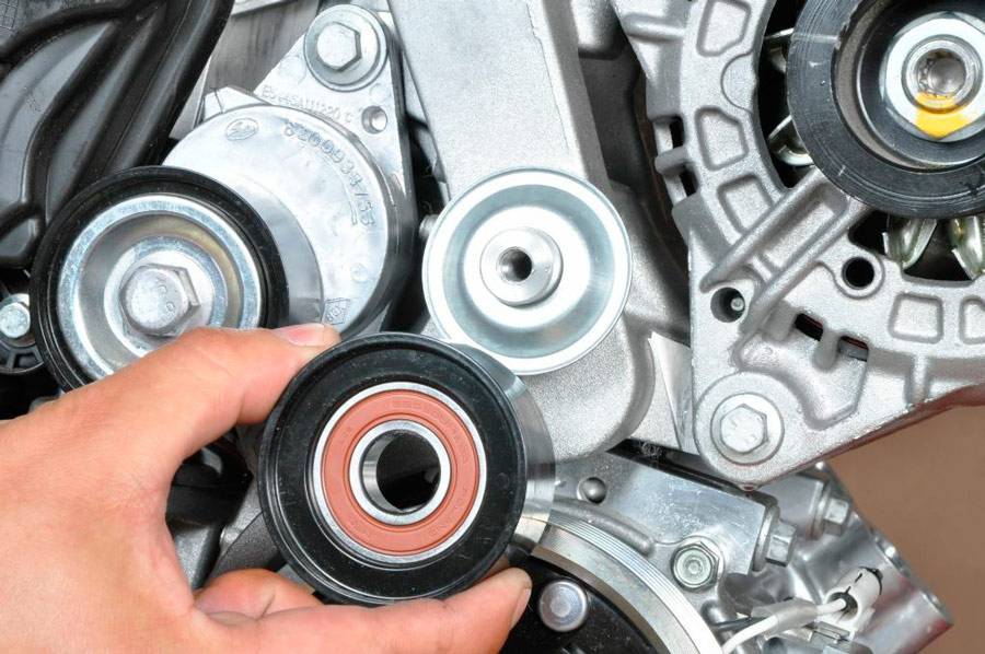 Берём ключ под номером 16 и ослабляем болт на натяжителе. Сбрасываем ремень со шкива и коленвала и выдёргиваем сверху. Делаем это аккуратно, чтобы не повредить другие детали. В результате натяжной и опорный ролики начинают болтаться. Нам нужно будет просто открутить их ключом на 10. Уже после этого необходимо внимательно осмотреть ролик. Если на нём имеются явные признаки износа, то обязательно нужно менять. В противном случае приводной ремень будет скидываться во время езды. Также нужно проверить состояние подшипника, издаёт ли он звуки скрипения и есть ли внутри смазка.