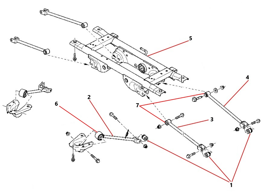 - Подрамник. Он поменьше, чем спереди, имеет другую форму, отличается и система крепления к кузову.
