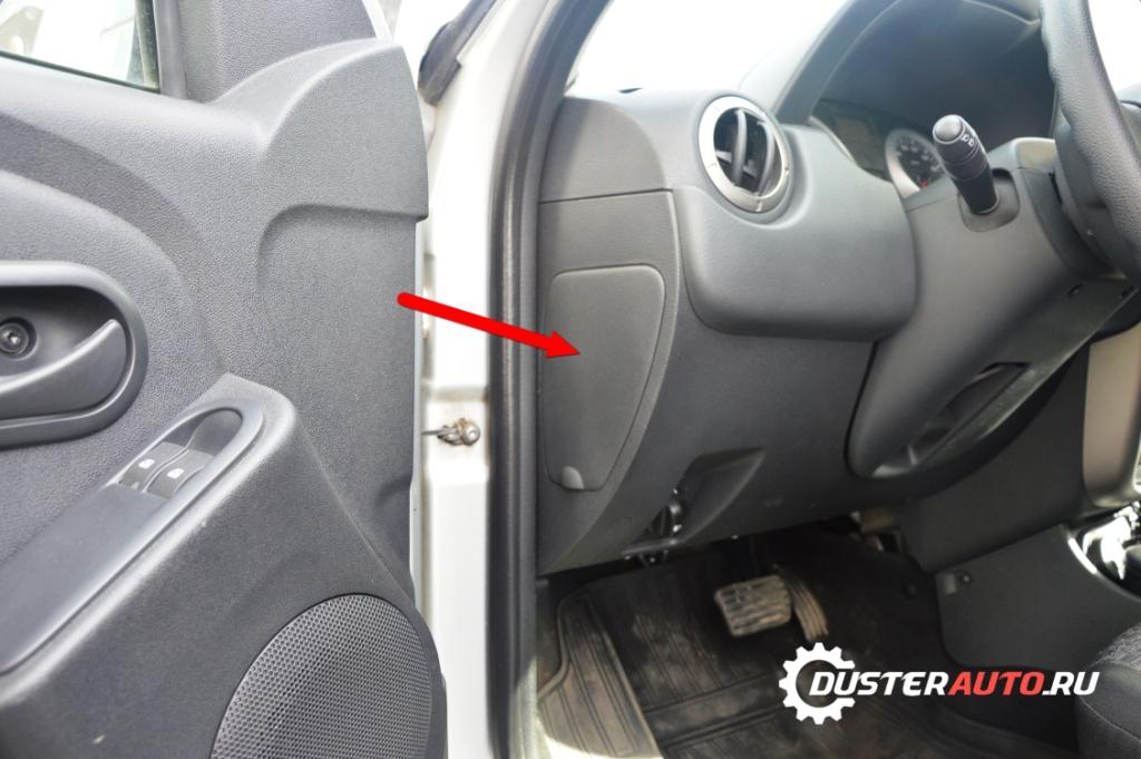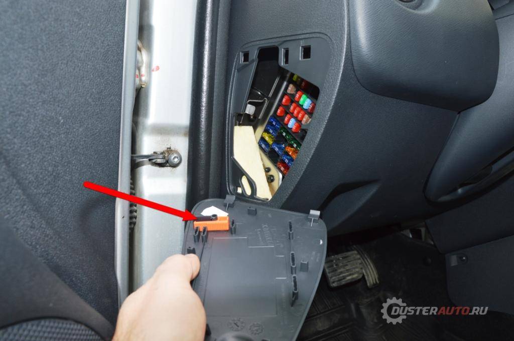 Автопроизводитель Renault позаботился и разместил в Дастере комплект запасных предохранителей на случай поломки в дороге. Там же находится пинцет для удобства установки предохранителей. Но где искать этот комплект? Всё просто, он спрятан за крышкой отсека с предохранителями слева от водителя с торца передней панели и доступен при открытой передней двери: