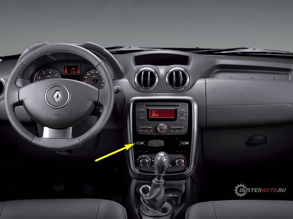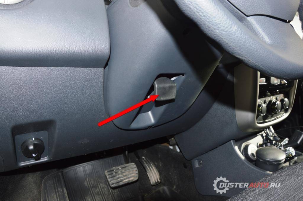 Руль на Рено Дастере можно регулировать по высоте, правда имеется всего 2 положения, но это лучше чем совсем ничего. Кнопка регулировки руля находится снизу рулевой колонки.