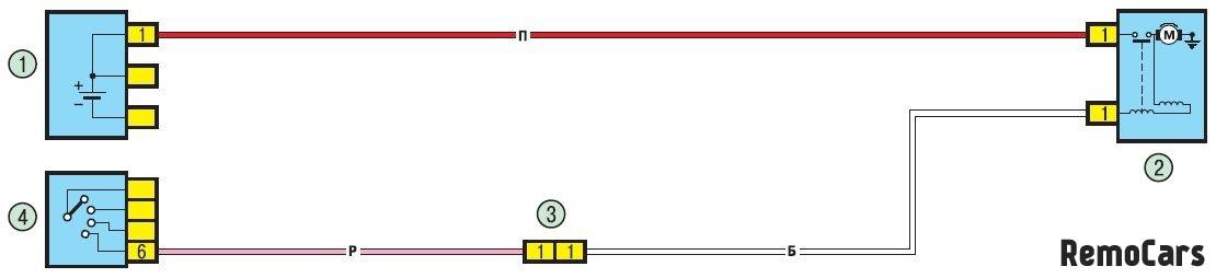 Схема подключения замка зажигания Рено Логан распиновка: 1 — аккумуляторная батарея; 2 — стартер; 3 — разъем электропроводки моторного отсека/салона (моноблок); 4 — выключатель замка зажигания.