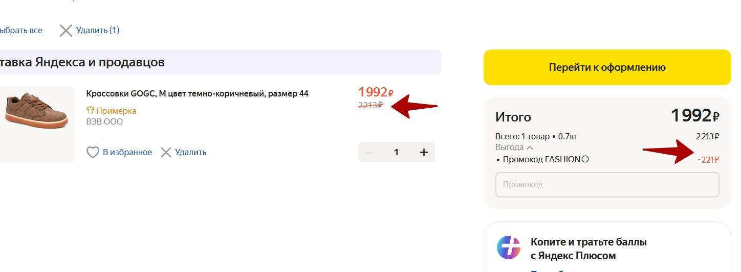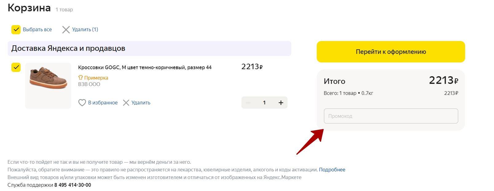 Обратите внимание на поле «Промокод», которое находится после кнопки «Перейти к оформлению»