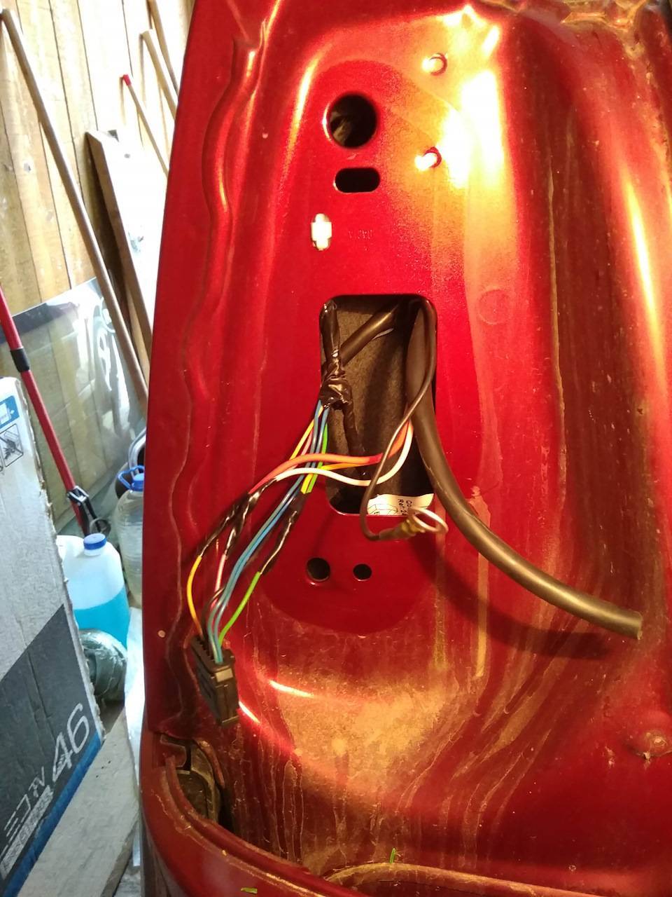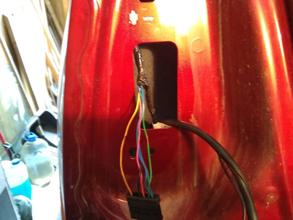 5. Комплектная проводка подключается на оба фонаря.С левого берется: сигнал поворота, сигналы торможения, противотуманный фонарь и масса.С правого — сигнал поворота, габариты и подсветка номера.Я протянул провода по верху поперечной балки, закрепляя стяжками. Слева — вывел в багажник через резиновую заглушку для провода подсветки номера, справа — проделав отверстие в заглушке в “кармане” багажника.