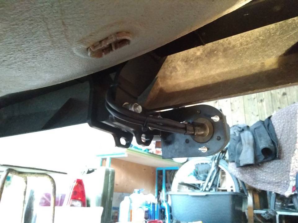 - Кронштейны закрепляют на кузове, используя сборку из винта М10, шайбы, втулки, второй шайбы и гайки. Ни одну из гаек пока не затягивают!