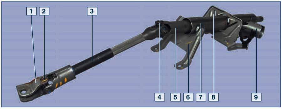 Рулевая колонка: 1 — соединительная муфта; 2 — нижний карданный шарнир; 3 — промежуточный вал; 4 — верхний карданный шарнир; 5 — вал рулевой колонки; 6 — нижний кронштейн крепления колонки; 7 — труба; 8 — верхний кронштейн крепления колонки; 9 — гнездо выключателя зажигания
