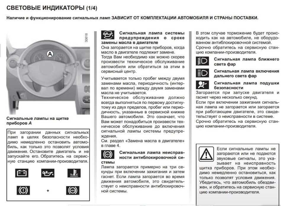 Красная иконка с восклицательным знаком в кружке — указывает на включение стояночного тормоза и недостаточный уровень тормозной жидкости в бачке. Зеленые стрелочки — мигают при включении поворота или аварийки. Желтая иконка двигателя похожая на мясорубку — check engine загорается и гаснет при включении индикаторы на панели приборов рено логан.
