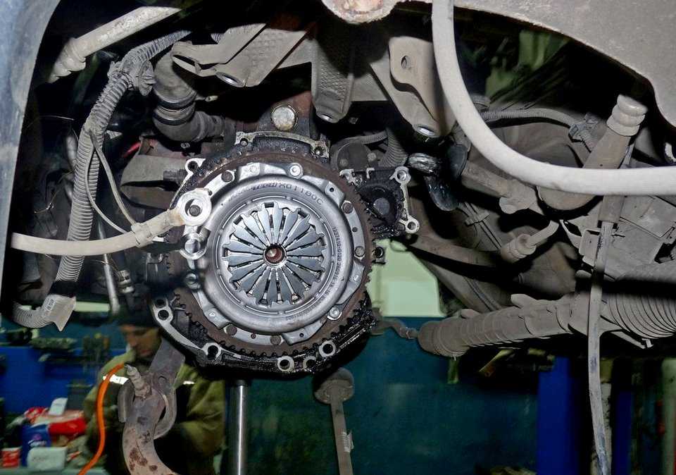 Процедуру снятия узла начинают с установки машины на яму. КПП можно не снимать, но следует освободить коробку от опор и отсоединить её от двигателя. Маховик надо зафиксировать длинной отвёрткой — чтобы не вращался, когда откручиваются болты нажимного диска.