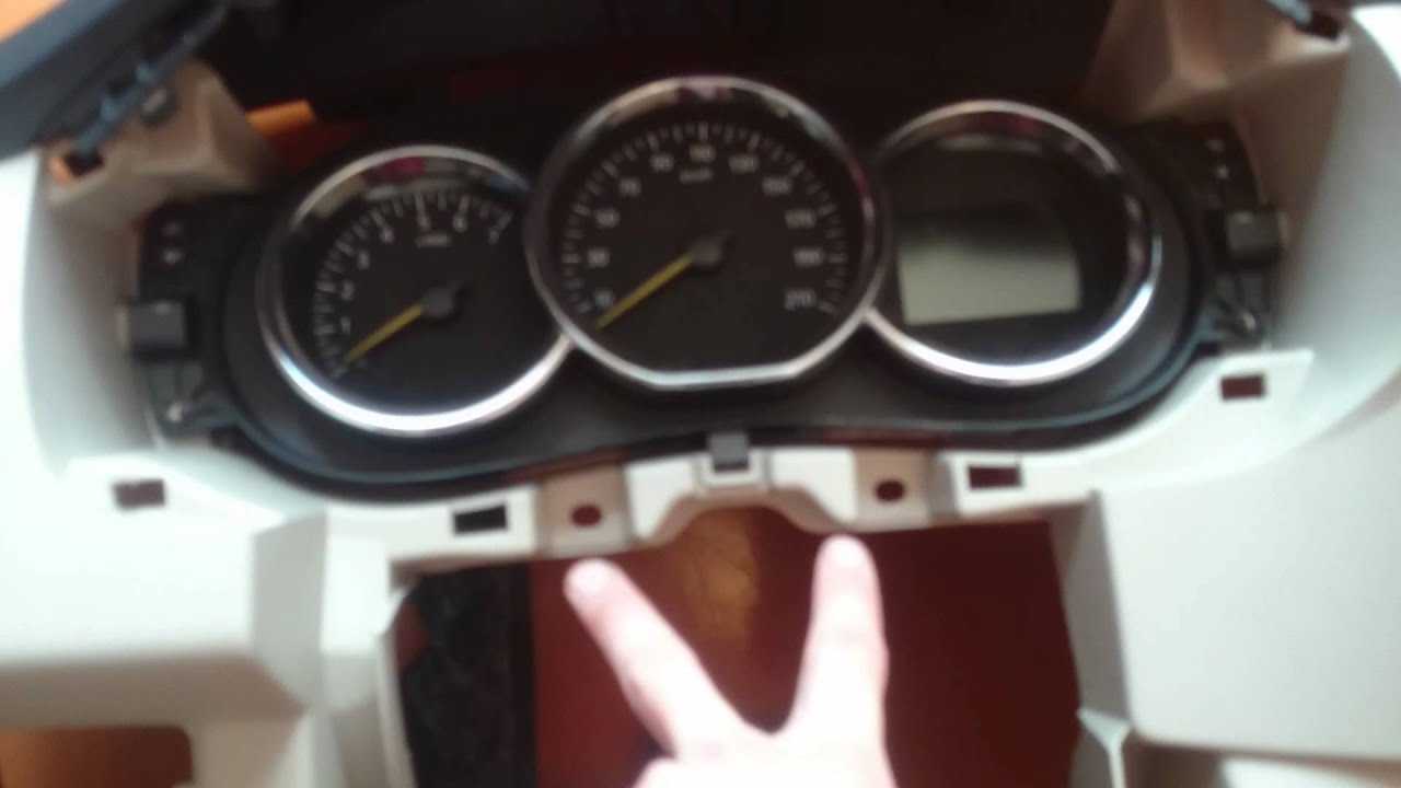 Снимаем комбинацию снятие торпедо рено сандеро. Плату с приборами кладем на заднюю сторону, чтобы не повредить стрелки. Разъем от платы я не отсоединял, и без этого вполне удобно. Далее протираем от пыли влажной тканью шкалу приборов, тщательно продуваем на воздухе стекла приборов с обратной стороны и тоже протираем их тканью.