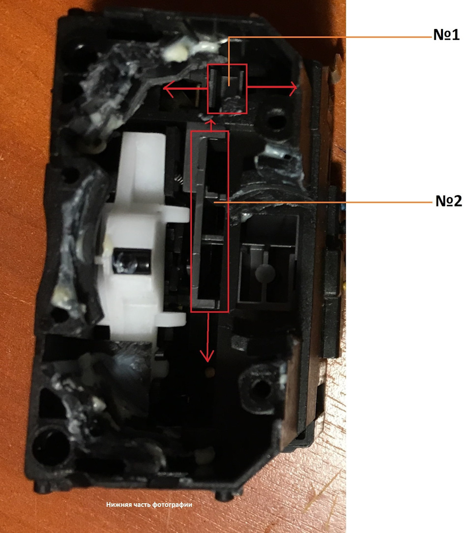 — при сборке усилия требуются только чтобы запрессовать бегунок переключения режимов света. Все остальные части собираются без усилий. Советую хорошо убедиться, что деталь села на место, прежде чем приложить усилия;— переключение режимов света и поворотников в механизме происходит с помощью двух бегунков:№1 — бегунок переключения режимов поворотников;№2 — бегунок переключения режимов света.