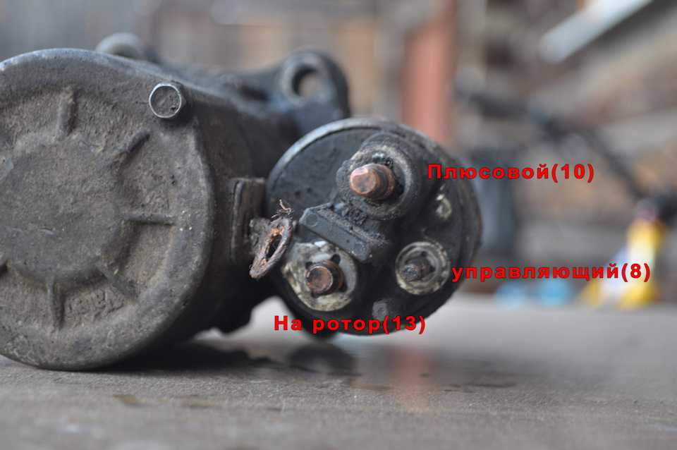 P.S. когда сняли стартер лучше сразу проверить целостность втягивающего реле, для этого берем аккум, крокодилом цепляем минус на корпус, подаем плюс на управляющий провод-срабатывает втягивающее и бендикс входит в зацеп, подаем плюс на ту самую клемму с 13 гайкой-срабатывет ротор и бендикс начинает крутиться как сумасшедший(лучше в этот момент держать стартер ногой, иначе он исполнит тройное сальто.P.P.S. если у вас все таки это случилось а завестись надо, мне лично помогало немного протолкнуть машину на скорости, видимо тогда бендикс входил в зацепление и машина заводиласьНу вот, в целом, все выглядит как то так, надеюсь мой пост кому нибудь да поможет