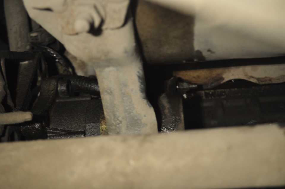 Снимаем именно правое колесо для безопасности дополнительно зафиксируйте автомобиль, если работаете из ямы Далее выкручиваем два болта у тяги, которые закрепляют подрамник к кузову и демонтируем.