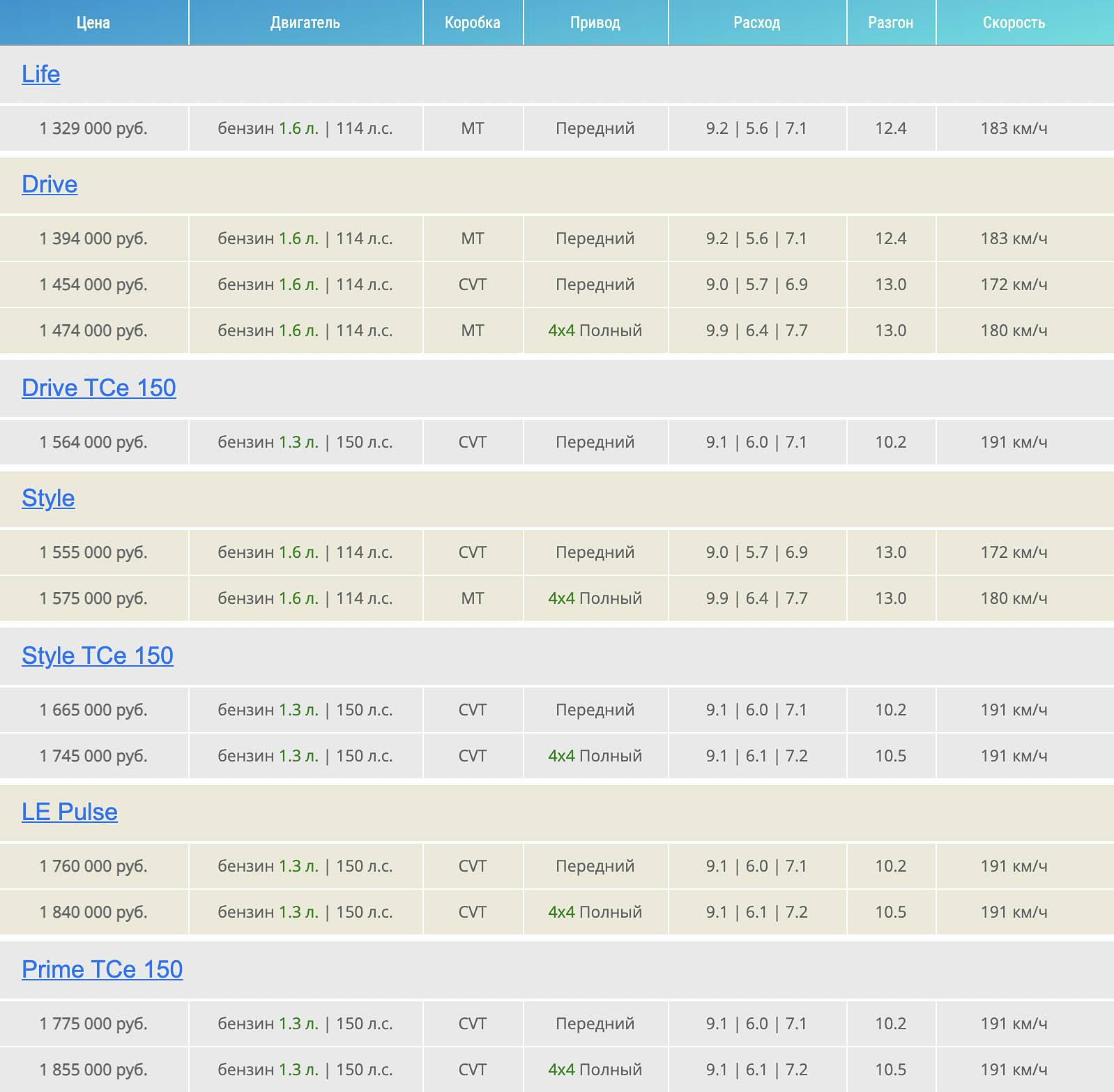 | 1.3 TCe 150 CVT 4×4 Edition One | бензин | 1.33 | 149 | CVT | полный | 10.5 | 191 | 9.2 / 6.2 / 7.1 | 1 498 990 |