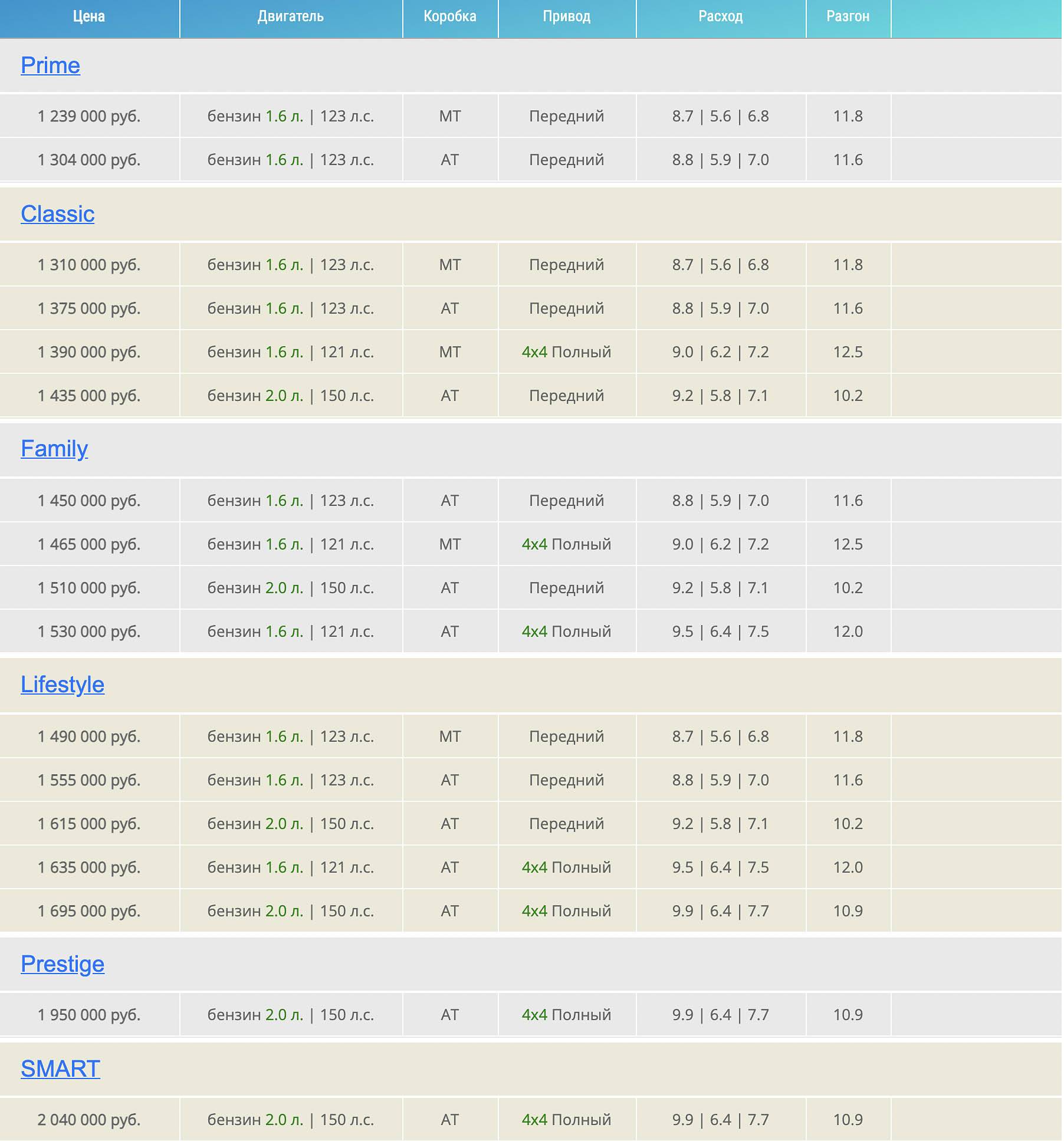 | 1.6 MT 4×2 Life | бензин | 1.6 | 114 | механика | передний | 12.4 | 183 | 9.3 / 5.7 / 7.1 | 998 000 |