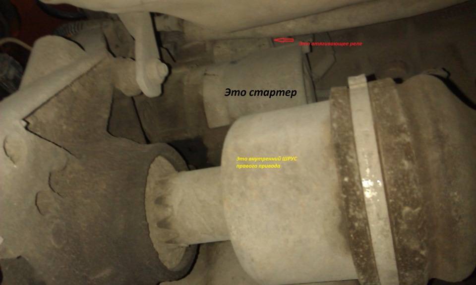 Немного видно втягивающее. Если питающая шпилька не отломилась, как у меня, то надо открутить силовой провод. Гайка там на 10, откручивается высокой головкой, так как шпилька торчит из нее милиметров на 10. Реально подлезть маленькой трещеткой. Фото сего действа я не делал, так как у меня она уже отвалилась сама — пришлось лишь вытянуть провод из аккумуляторного отсека, чтобы его длины хватило выйти справа от двигателя ( ну то есть поближе к тому месту, где болты стартера), и там уже отсоединить клемму от шпильки — держал шпильку пассатижами, а гайку крутил. Шпилька кстати, сломалась нафиг во время этого процесса.