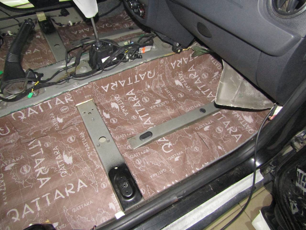 - Оклеиваем шумоизоляцию под педалями и месте для ног пассажира.