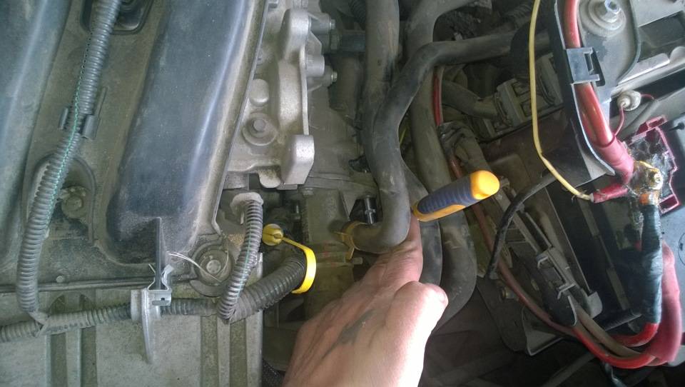 - переместите нижний хомут патрубка подачи охлаждающей жидкости от радиатора к блоку по шлангу, сжав пассатижами загнутые ушки;
