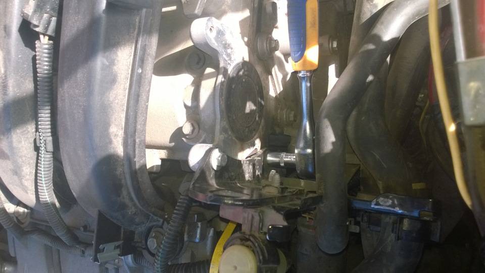 Сразу снял воздуховоды ведущие к фильтру двигателя.Кронштейн крепления патрубков для антифриза, легко снялся открутив всего два болта. Все это, чтобы обеспечить свободный доступ к корпусу термостата.