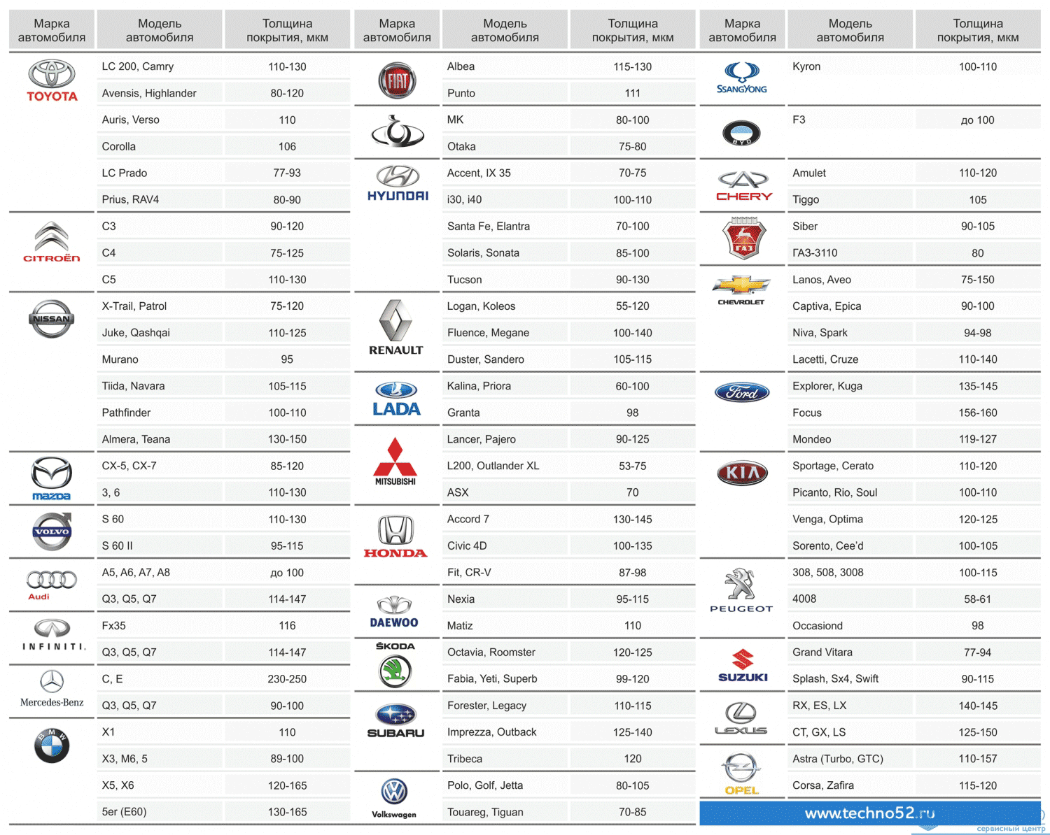 - Заводская толщина лакокрасочного покрытия автомобилей (таблица для разных марок и моделей);