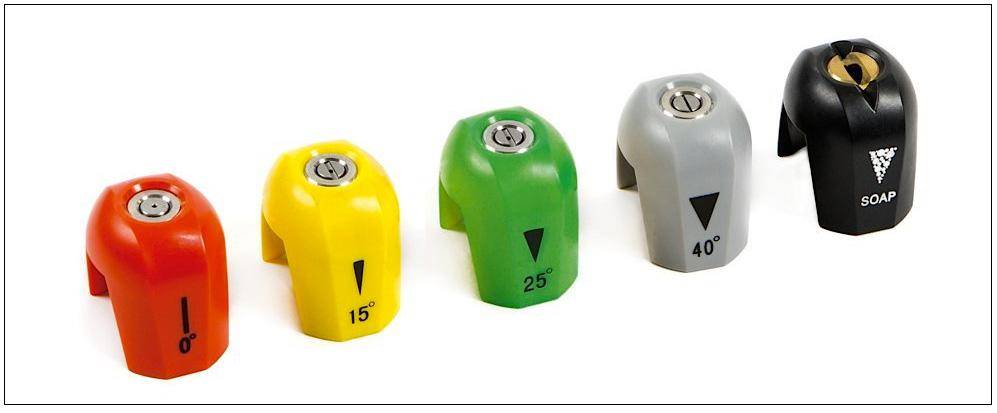 Насадки с разной шириной распыляемого “факела” и для нанесения чистящего средства. Обычно комплектуются с мощными мойками.