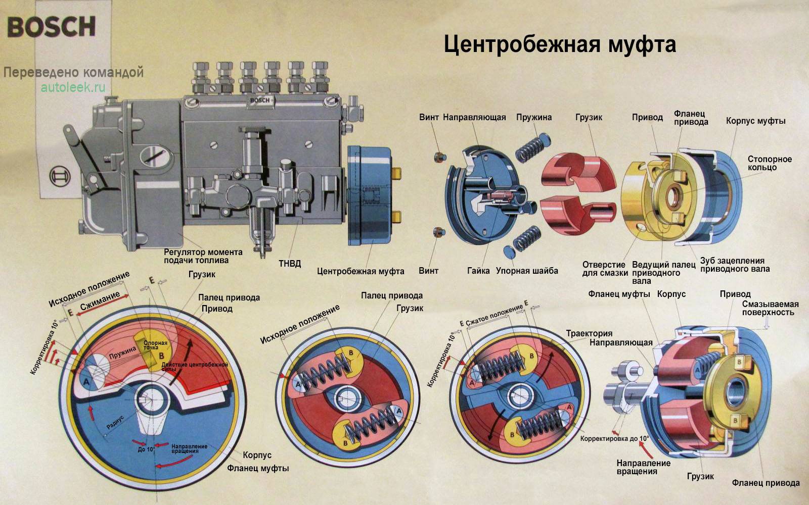 И это обеспечивает регулятор опережения момента впрыска. В полностью механическом насосе в его качестве выступает центробежная муфта, установленная на кулачковом валу насоса.