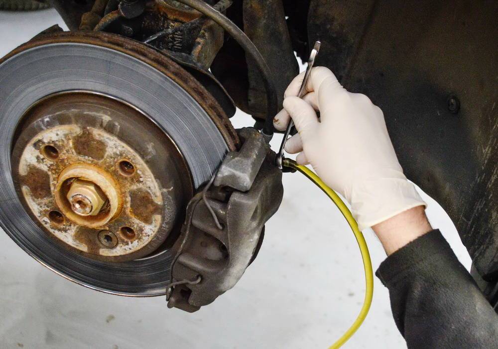 - По аналогичной методике удалить раствор из суппорта переднего левого колеса.