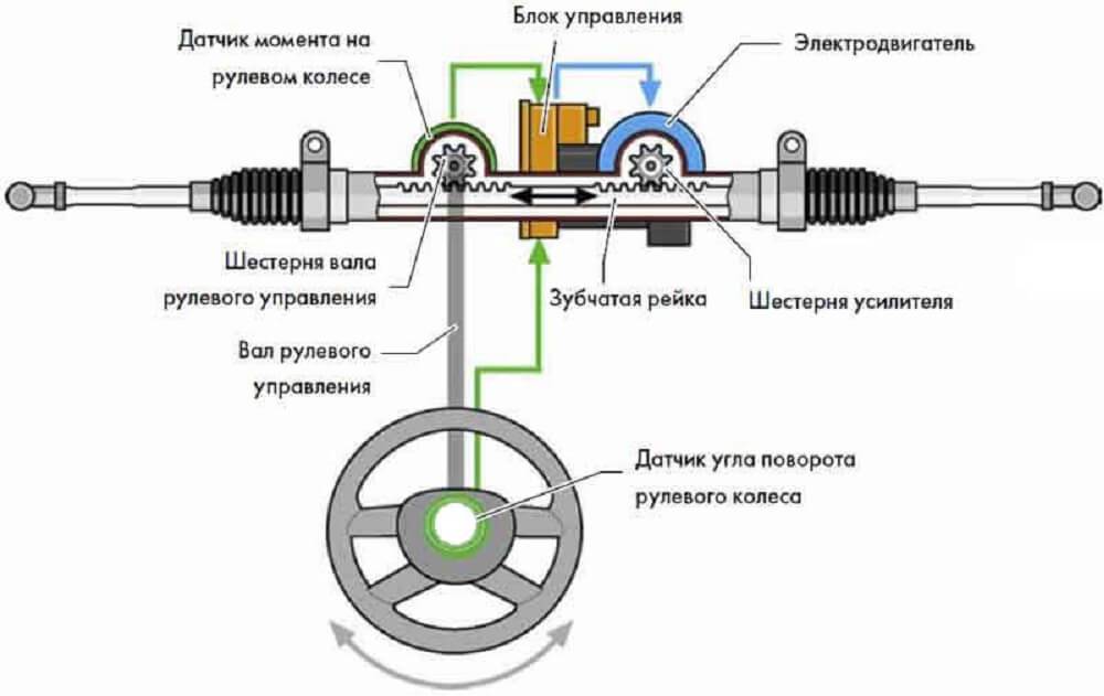 - датчик при повороте рулевого колеса регистрирует данные о вращении торсионного вала;