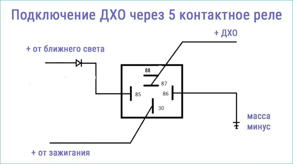 Итак, вам может показаться, что универсального выхода нет и любая схема имеет серьёзные недостатки. Это не так. На самом деле есть целых две схемы, которые учитывают все требования и вполне могут использоваться без нарушений. Первая из них – подключение дневных ходовых огней с помощью реле с пятью контактами. Она учитывает все недостатки предыдущих способов и устраняет их. Выглядит эта схема так.