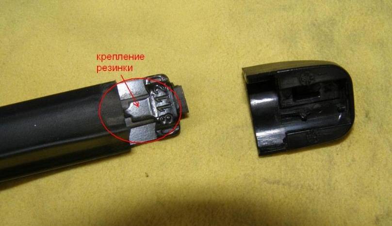 Процесс замены резинок на бескаркасном очистителе очень прост, для этого снимают боковые пластиковые заглушки и достают резинку, которую удерживают две металлические пластины. Главное, не сломать металлическую основу.