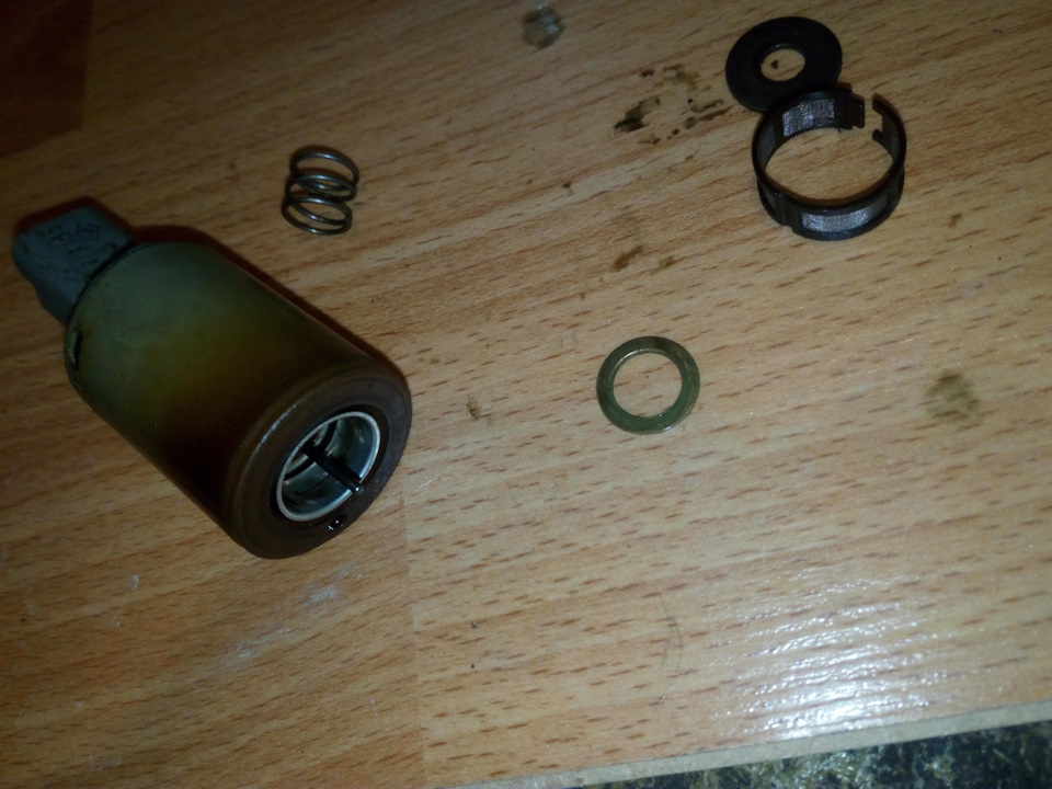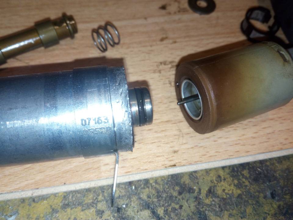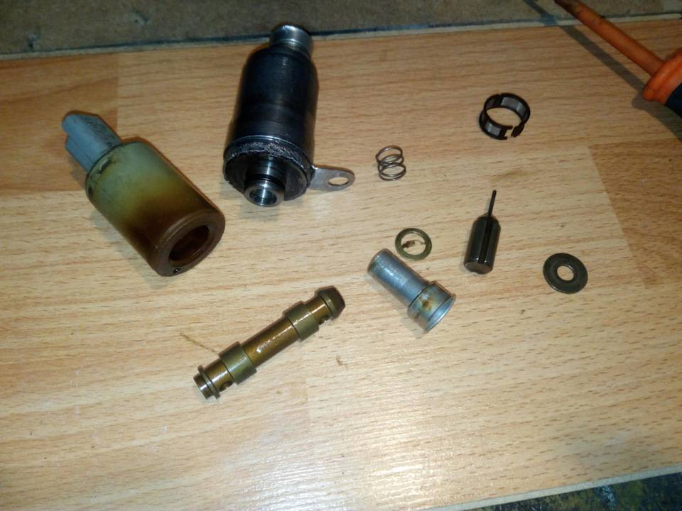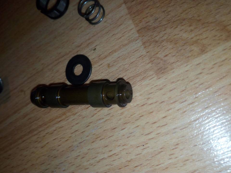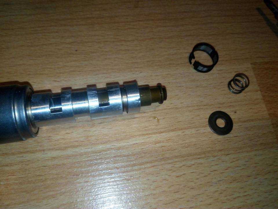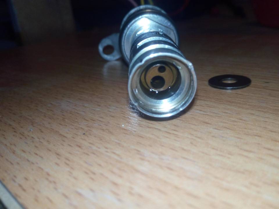 Внутри находится тот самый шток, который и обеспечивает подачу или прекращение подачи давления масла на фазорегулятор.