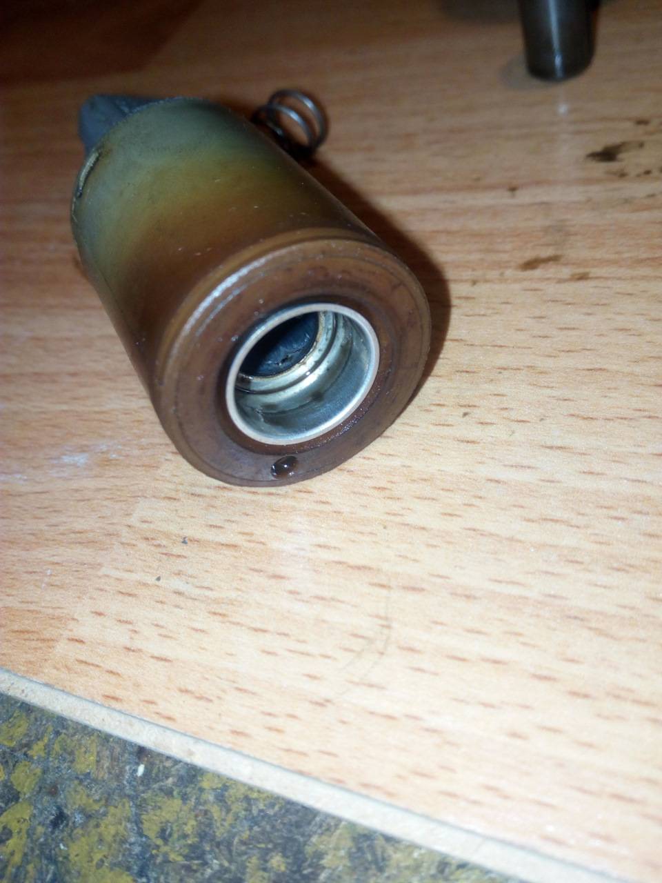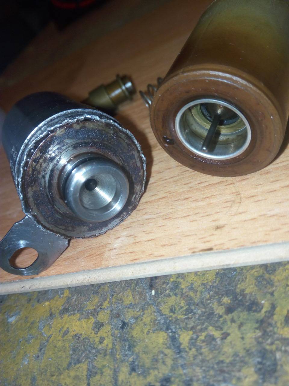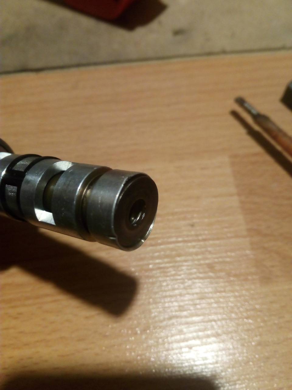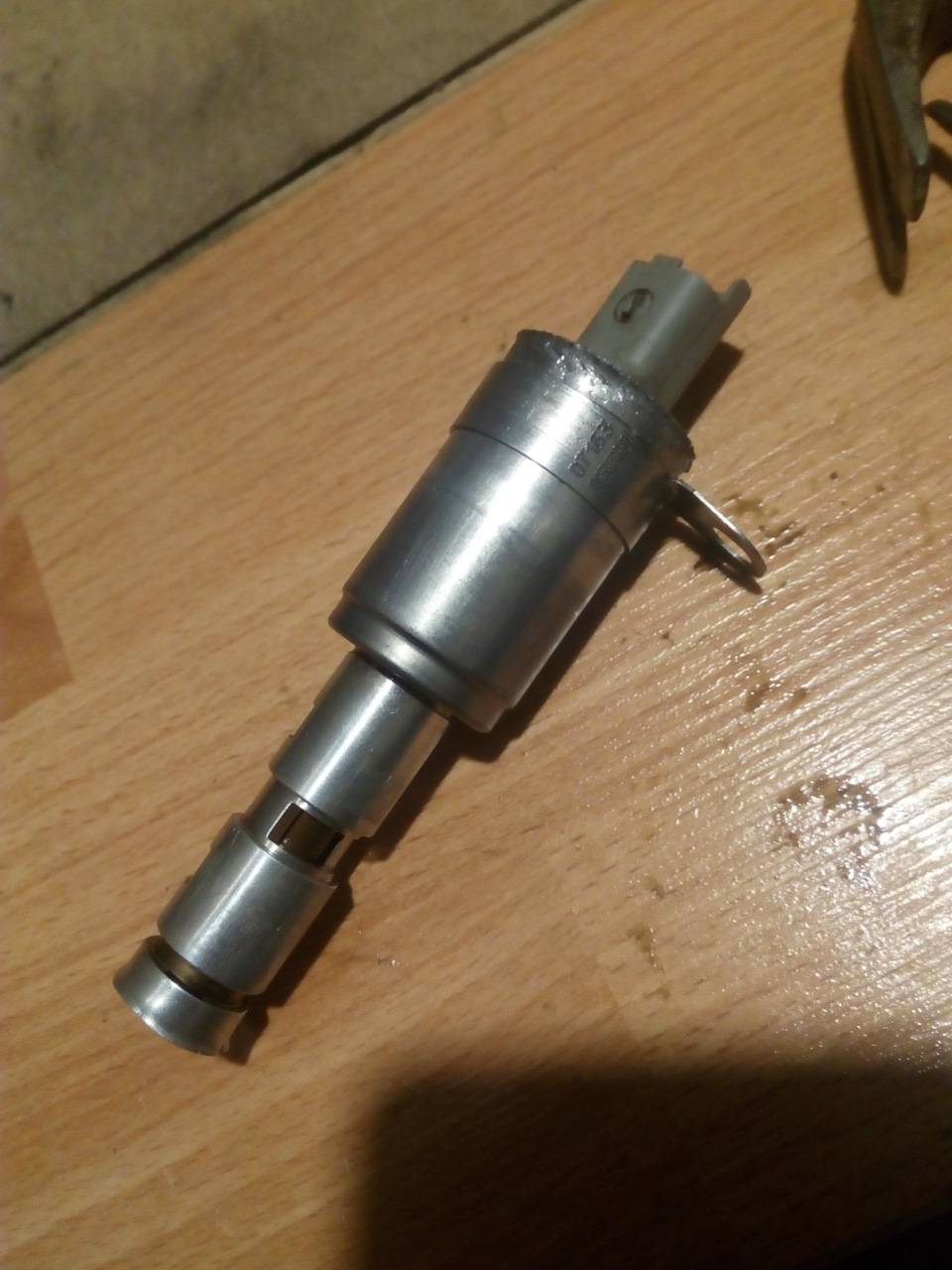 Внутри находится тот самый шток, который и обеспечивает подачу или прекращение подачи давления масла на фазорегулятор.