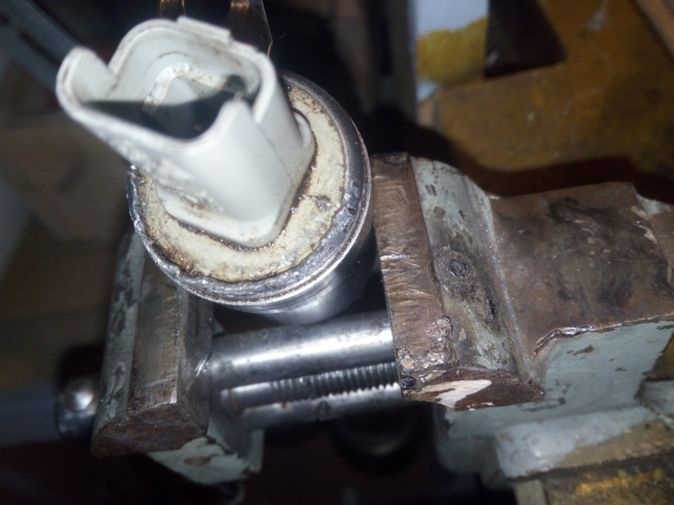 Для того, чтобы разобрать верхнюю часть клапана, необходимо разогнуть обжим металлического корпуса. зажимаем в тиски и сподручными инструментами разгибаем.