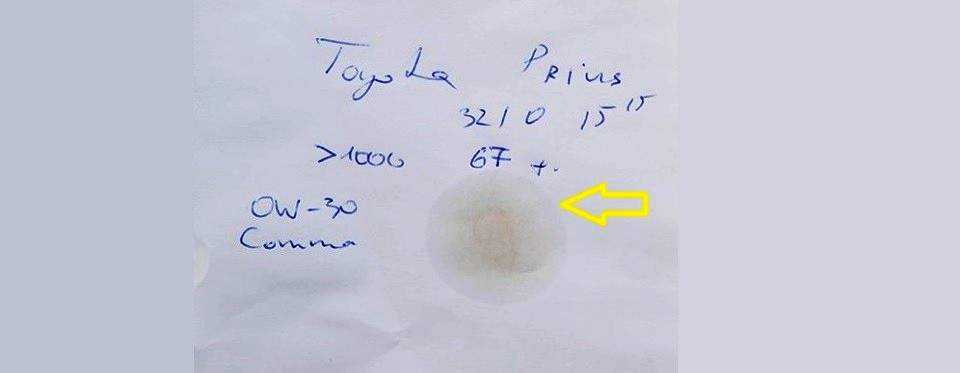 Анализ засохшей капли масла из двигателя Toyota Prius: ядро светлое (смазка залита недавно), цвет второго круга тоже относительно светлый (масло еще не состарилось), контур третьего круга равномерный, без зигзагов и колец желтого цвета (воды и антифриза нет).