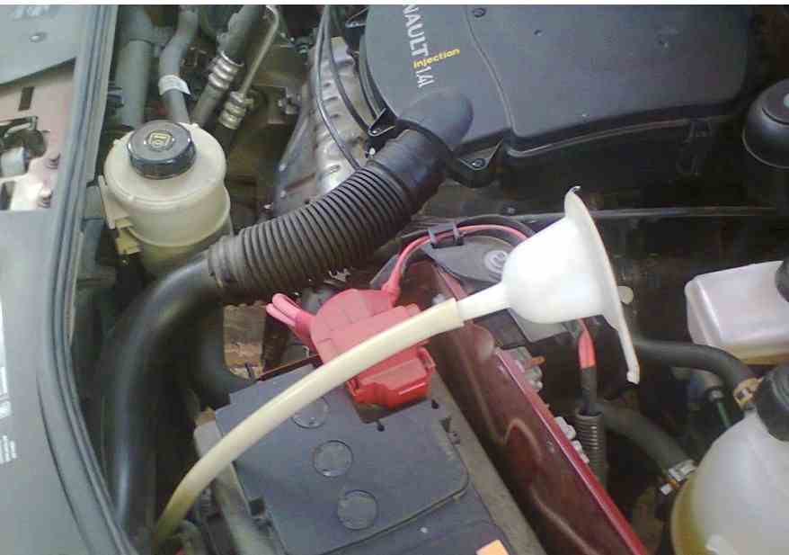 - Вставить в заливное отверстие шланг от нагнетателя или воронки. Если используется воронка, то её шланг опускается из подкапотного пространства.
