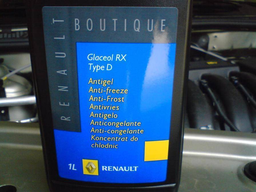 При замене рекомендуется помимо его использовать оригинальный антифриз Renault Glaceol RX Type D, который также известен под брендом Elf и также имеет желтый цвет.