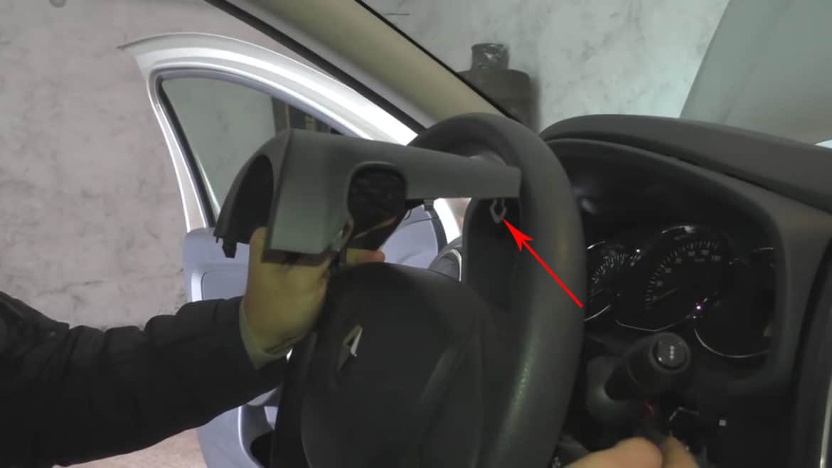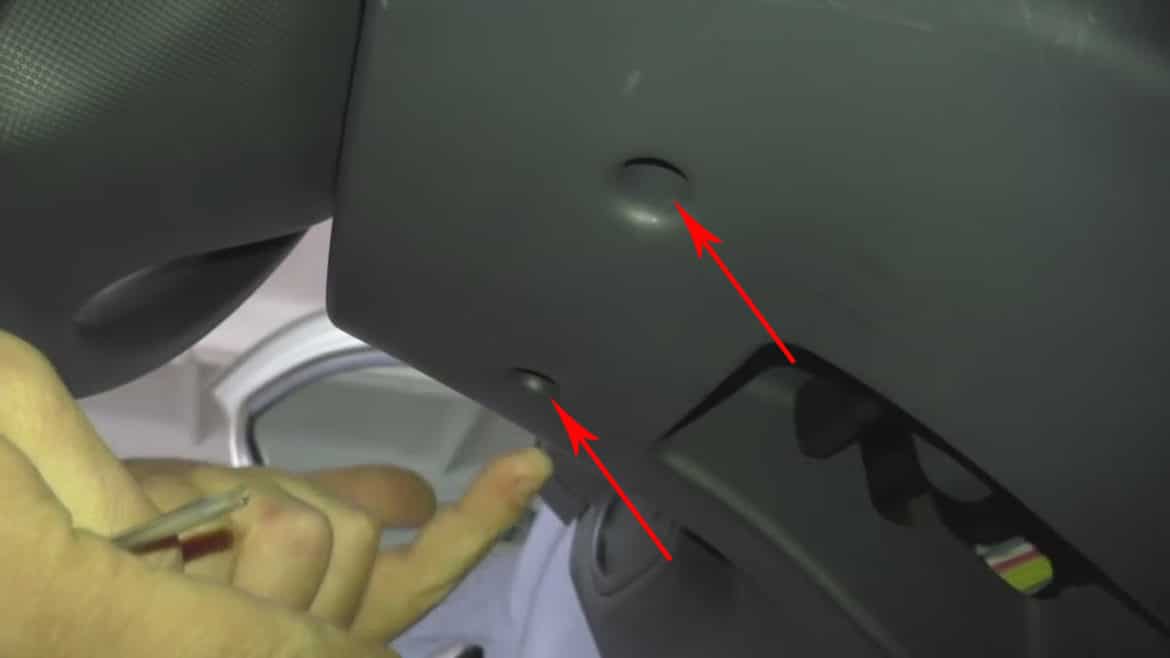 В первую очередь нужно снять кожух рулевого колеса, точнее, его верхнюю часть. Берем ключ TORX 20 и отворачиваем два винта, находящиеся в нижней части кожуха, под рулевой колонкой. Местонахождение этих винтов я указал стрелками.