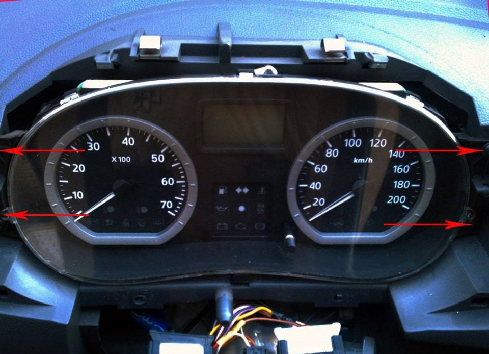 Чтобы добраться до подсветки и индикации, приборную панель придется разобрать. Для этого сначала снимаем защитное стекло, которое крепится на защелках. Особых усилий к ним не прилагаем, чтобы не обломать.
