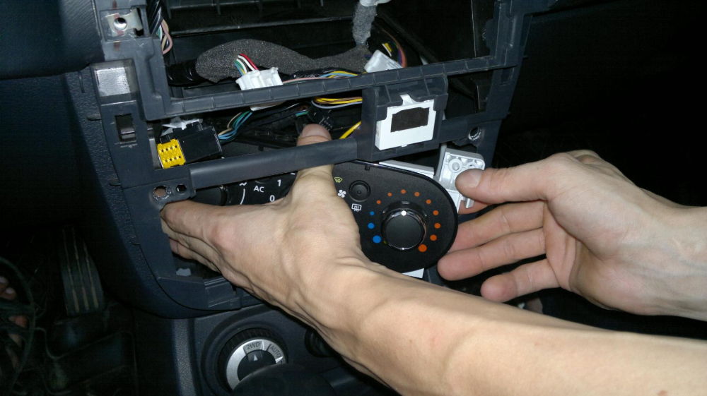 6. Снимаем блок управления климатической установкой с верхних фиксаторов сместив блок во внутрь центральной консоли и выводим (вверх) из пазов нижние фиксаторы. Затем немного разворачиваем блок для того чтобы снять разъем или отсоединить тросы управления заслонками