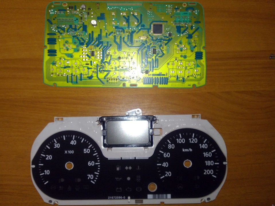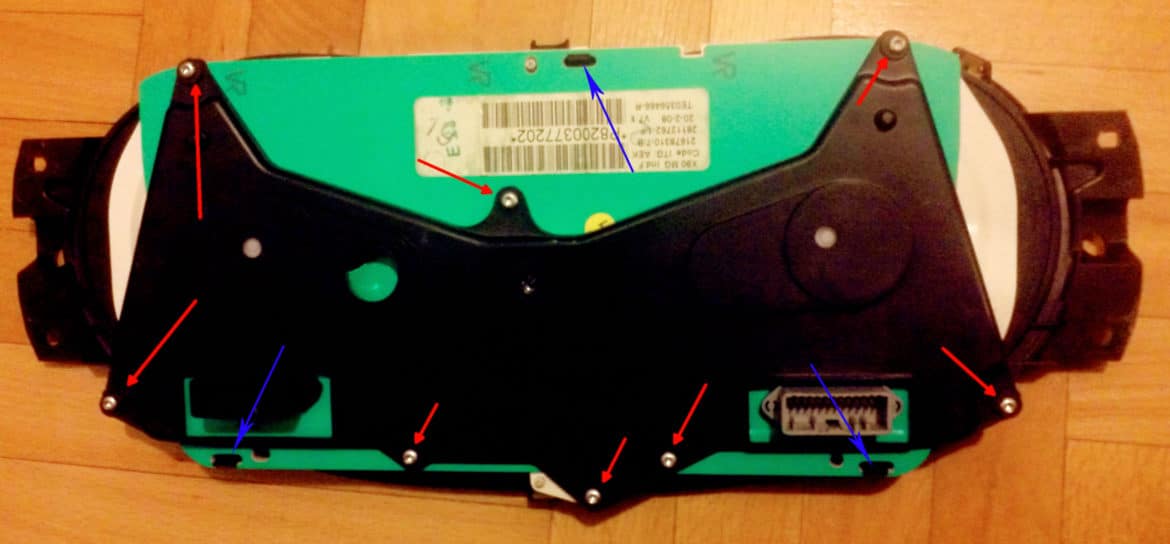Переворачиваем панель «лицом» вверх и снимаем стрелки со спидометра и тахометра. Для этого, слегка потянув на себя, проворачиваем их против часовой стрелки. Сразу отмечу, что, устанавливая стрелки на место, их нужно поворачивать в ту же сторону, но не тянуть, а вдавливать. Снова переворачиваем устройство, аккуратно отжимаем три фиксатора (синие стрелки на фото выше) и снимаем плату.